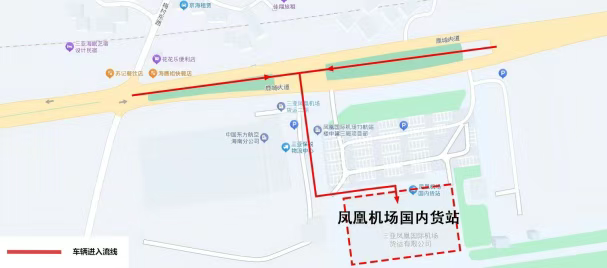 装载海关监管货物的车辆从鹿城大道转向三亚凤凰机场“二线口岸”国内货站,货物经海关监管通道(1号、6号安检通道)过检,获取海关放行指令后装机离岛。(见图1)