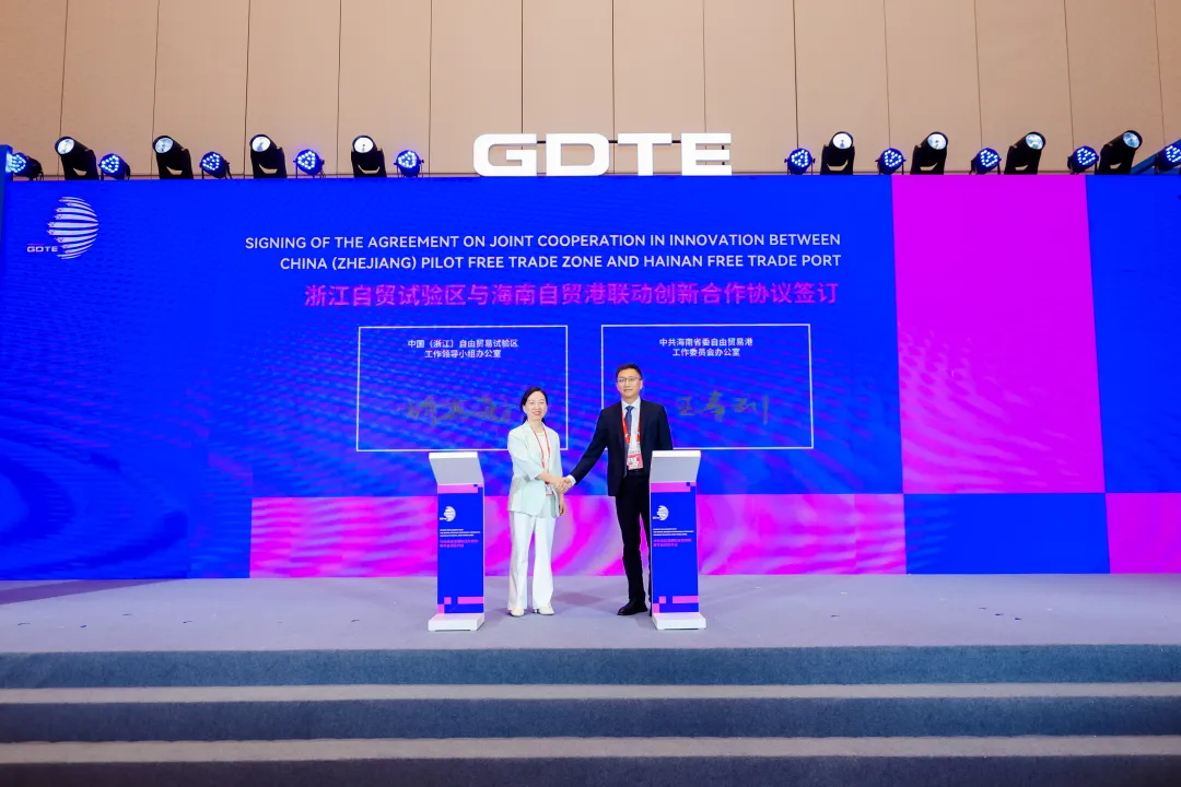 9月26日上午,在第四届全球数字贸易博览会期间,浙江自由贸易试验区与海南自由贸易港举行全面深化合作签约活动。海南省委深改办(自贸港工委办)副主任王奉利与浙江省商务厅副厅长胡真舫共同出席,并正式签署《中国(浙江)自由贸易试验区海南自由贸易港联动创新合作协议》。
