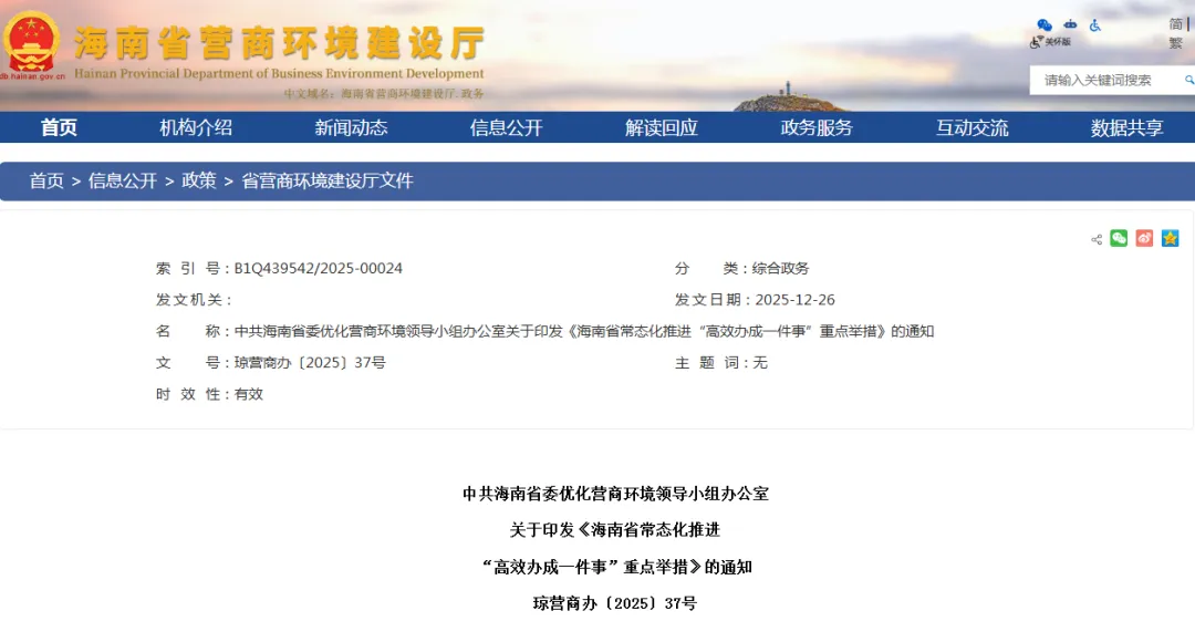 海南省委优化营商环境领导小组办公室近日印发《海南省常态化推进“高效办成一件事”重点举措》(以下简称《重点举措》),从健全推进机制、优化服务体系、创新服务模式、数字赋能、加强组织实施等五方面提出26条重点举措,推动在更多领域更大范围加强部门协同和服务集成,更好满足经营主体和个人办事需求,着力打造市场化法治化国际化一流营商环境。