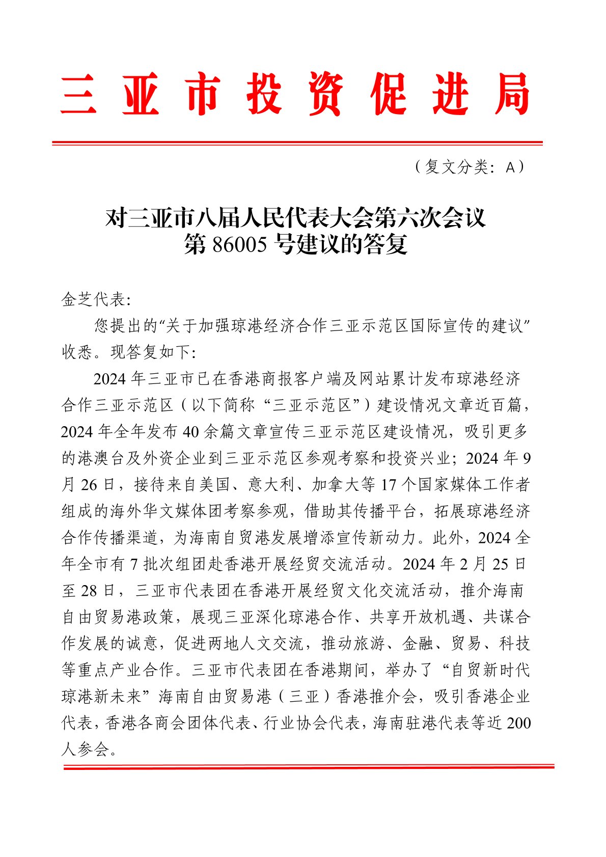 三亚市投资促进局对三亚市八届人民代表大会第六次会议第86005号建议的答复