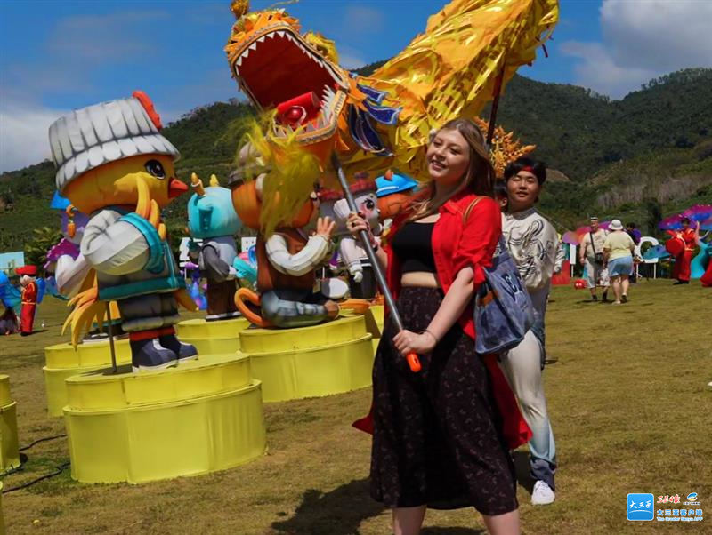 近日,外籍游客在三亚丝路欢乐世界景区参与舞龙体验活动,感受浓厚的民俗文化。