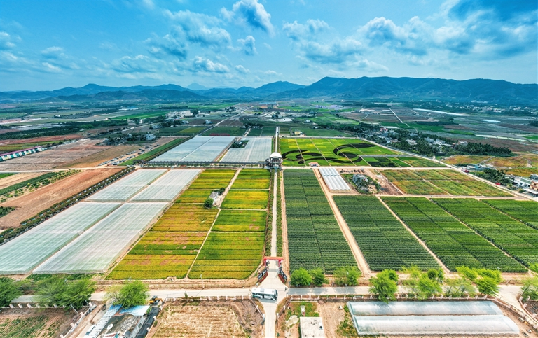 三亚崖州区国家现代农业(种业)产业园,温室大棚与特色种植区有序排布,勾勒出一幅产业兴旺、生态宜居的乡村振兴图景。(资料图)