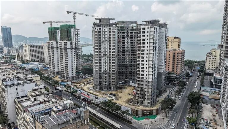 4月2日,中旅三亚湾项目施工现场,塔吊林立、车辆穿梭,施工人员正在进行钢筋绑扎、装饰装修等作业。