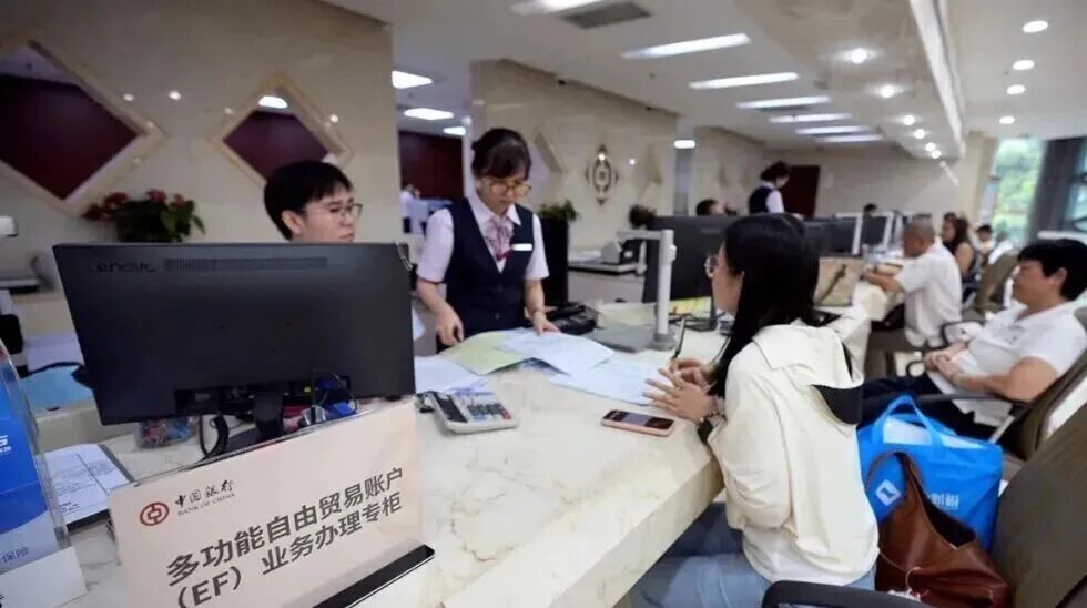 顾客在中国银行海南省分行多功能自由贸易账户(EF)业务办理专柜前咨询。