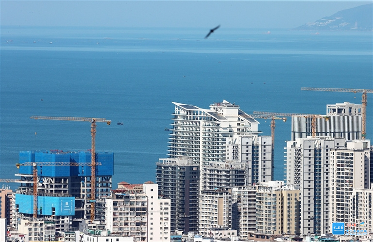 10月21日,从高处远眺三亚中央商务区凤凰海岸单元一处建设工地,一派热火朝天的施工场景,大型塔吊有序运转,项目建设“加速跑”。